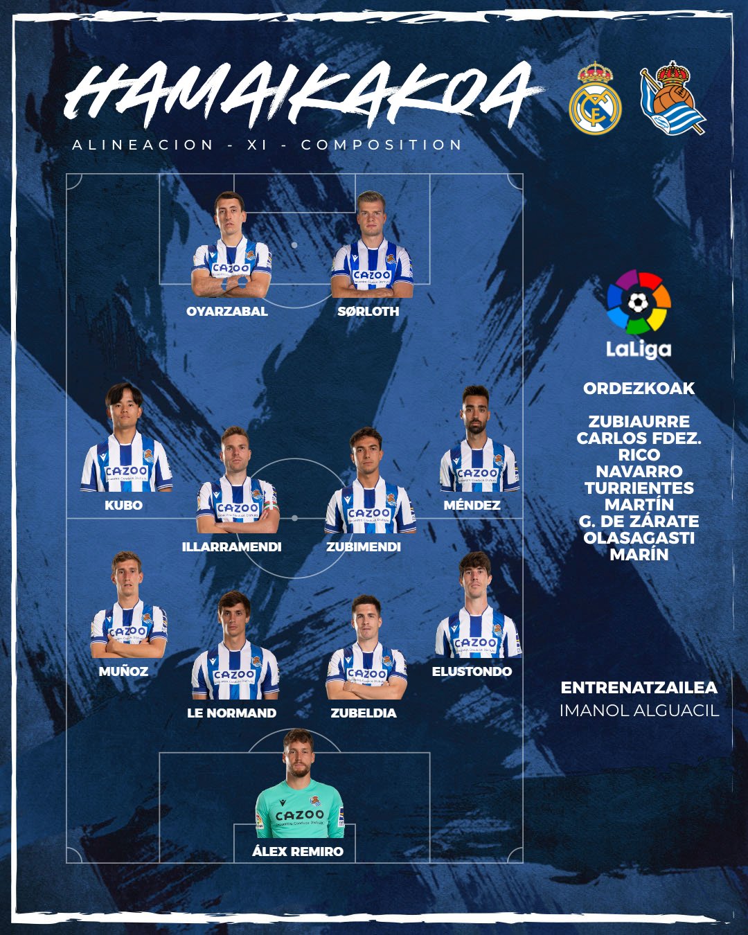 Remiro; Elustondo, Zubeldia, Le Normand, Muñoz; Brais Méndez, Zubimendi, Ilarramendi, Kubo; Oyarzabal y Sorloth.