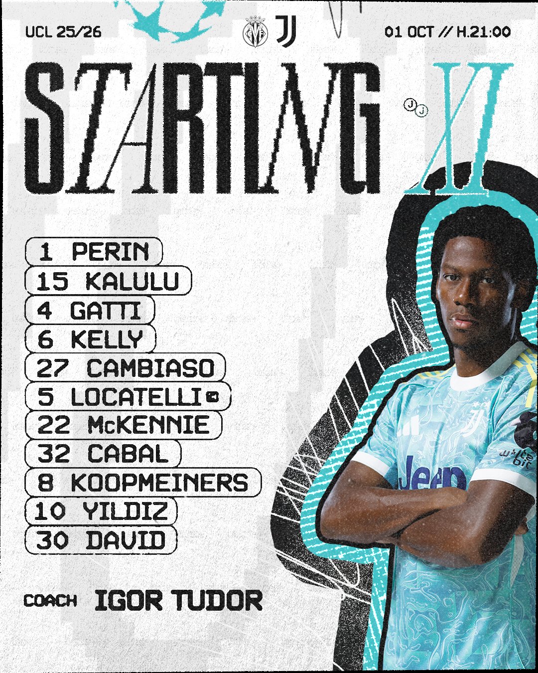 Igor Tudor sale con Perin; Kalulu, Gatti, Kelly; Cambiaso, Locatelli, KcKennie, Cabal; Koopmeiners, Yildiz y David.