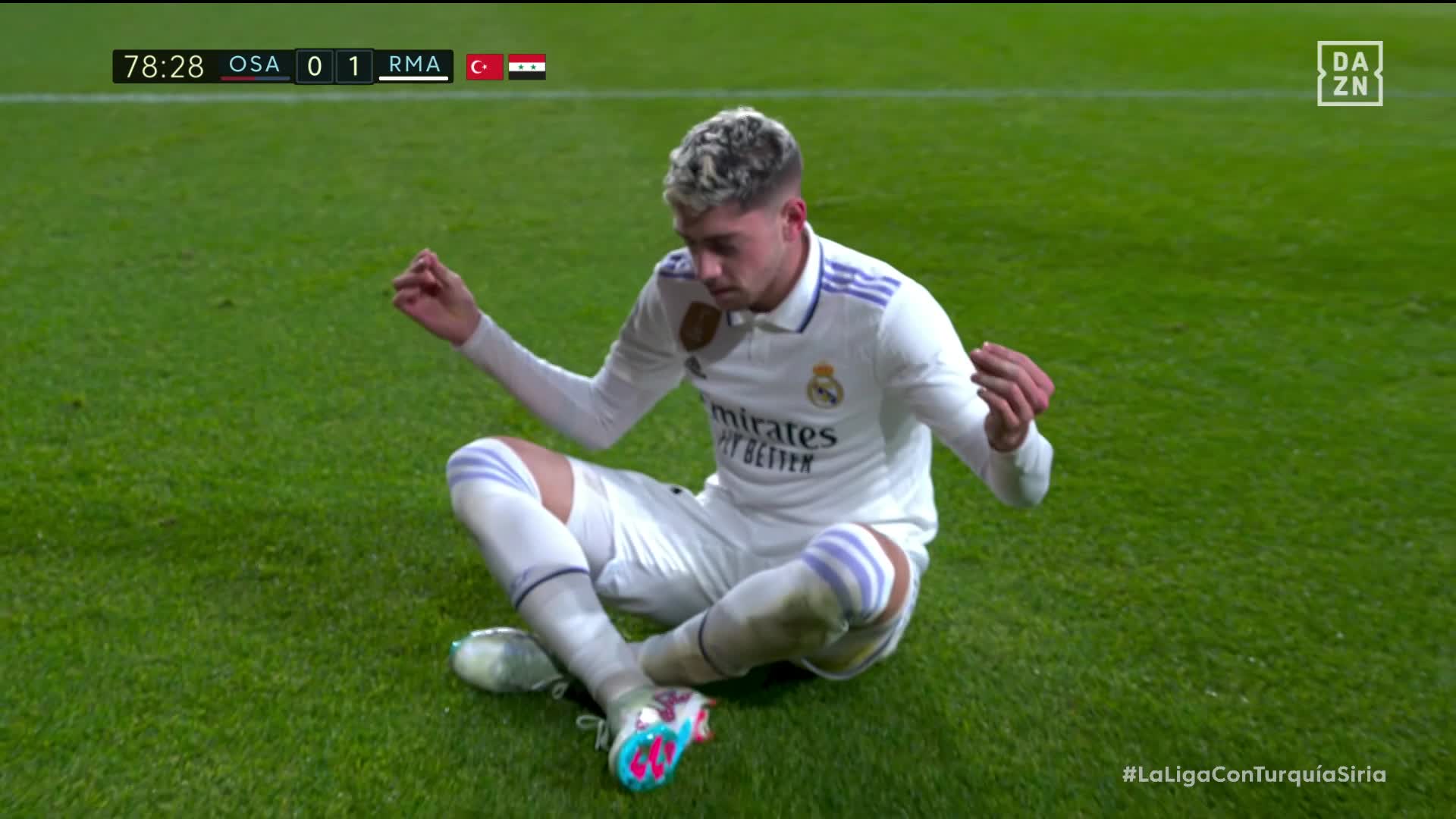 El Real Madrid ganó a Osasuna (0-2) con goles del uruguayo Fede Valverde en el minuto 78 y del español Marco Asensio en el 92, logrando un resultado que coloca al conjunto blanco a cinco puntos del líder, el Barcelona, con un partido más.