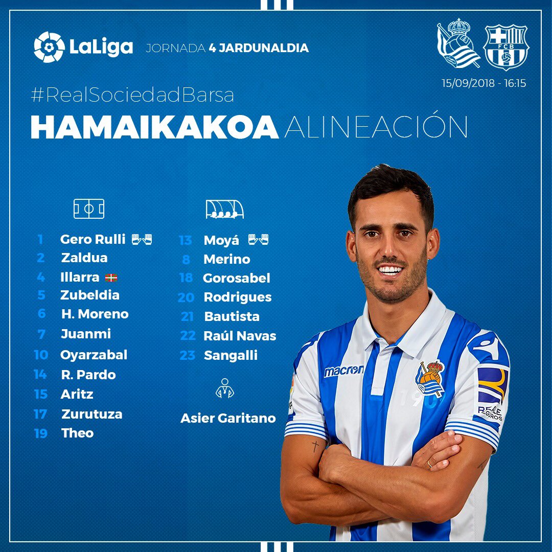 ¡Buenas tardes! Soy María Trigo y os voy a contar en directo todo lo que ocurra en el primer partido de la temporada 18/19 en el estadio de Anoeta. La Real Sociedad se estrena ante su afición con algunas bajas importantes y ante el FC Barcelona, el actual líder de LaLiga Santander.