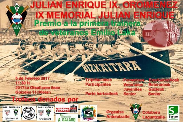 El IX Memorial Julián Enrique, organizado por Kaiku, reunirá el próximo domingo en la Ría a un total de 39 traineras, 26 de ellas sénior masculina. Lutxana, Laredo, Bermeo, Portugalete, Deusto, Getxo, Zierbena, Donostiarra, Santoña, Camargo, Arkote, Hondarribia, Pedreña, Isuntza, Getaria, San Pedro y los anfitriones de Kaiku son los clubes que han inscrito a una o varias tripulaciones para esta categoría en esta tradicional regata de pretemporada.