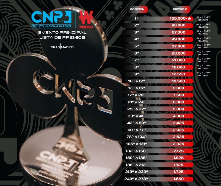 El CNP Winamax 2025 de Madrid vivirá este lunes su última etapa, en la que tiene que confirmar el campeón que se llevará los 155.000 euros y el trébol de campeón del torneo más numeroso de la historia de España. El empujón de Winamax, la mejor sala online de las que operan en España, al del mejor circuito nacional en vivo del país ha sido un éxito y este lunes (o martes de madrugada) vivirá su culminación. A las 16 horas empieza la competición.